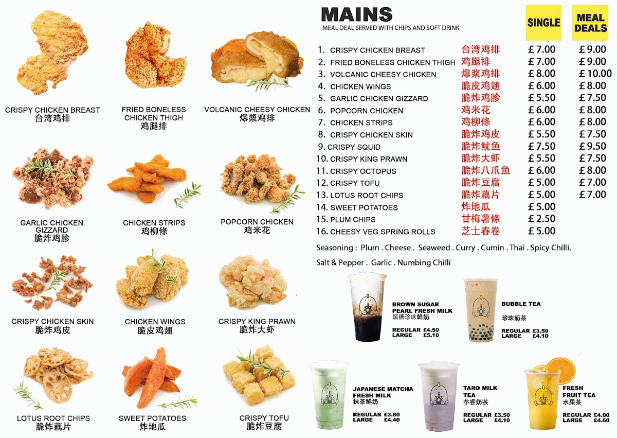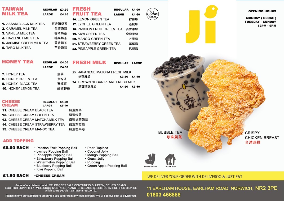 Ji The Chicken Shop in Norwich is a haven for lovers of crispy, flavorful chicken and authentic Taiwanese milk tea. Their menu boasts a variety of standout dishes, from the irresistibly juicy & crispy Chicken Breast and Fried Boneless Chicken Thigh to unique offerings like Garlic Chicken Gizzard and Volcanic Cheesy Chicken. Seafood options such as Crispy Squid, King Prawn, and Octopus provide delightful textures, while vegetarian choices like Crispy Tofu and Cheesy Veg Spring Rolls ensure something for everyone.